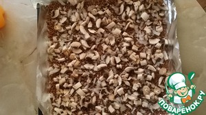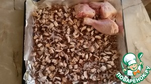 Подготовить грибочки, я их мою и чищу, затем мелко нарезаем кусочками, выкладываем сверху на противень