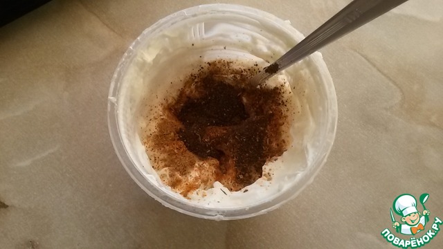 Готовим соус: в сметану добавляем мелко нарубленный чеснок, перец, специи для курицы ( куркуму, мускатный орех, тмин, майоран и другие по вашему вкусу)