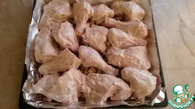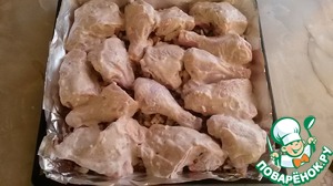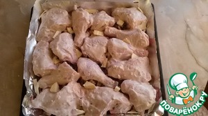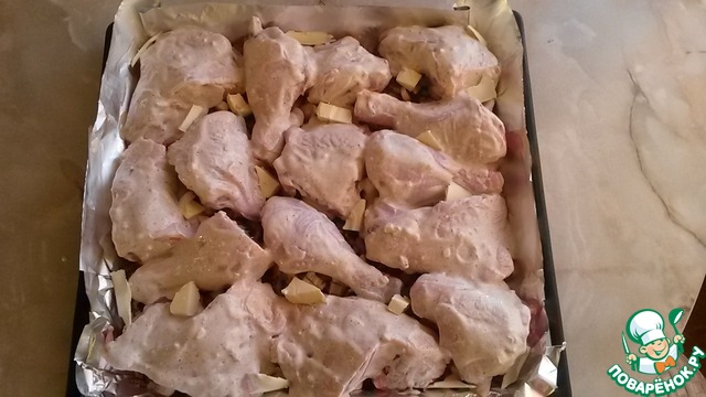 Окорочка или курочку режем на кусочки порционно, выкладываем на противень