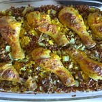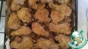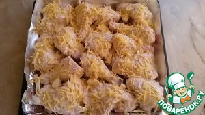 Посыпаем тертым сыром, солим воду и добавляем ее к нашему блюду (для начала 3 стакана, т. к. с курочки и соуса будет тоже сок). Всю эту красоту ставим в духовку на пол часа средний огонь, дальше проверяем готовность мяса, если необходимо подливаем еще водички по чуть-чуть, но не более 1 стакана