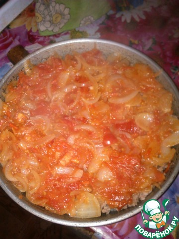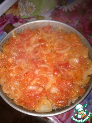 Лук и помидоры нарезать полукольцами и обжарить. Выложить на фарш и отправить в разогретую до 180 градусов духовку. Минут за 5 до готовности потереть сыр. Приятного аппетита ;-)