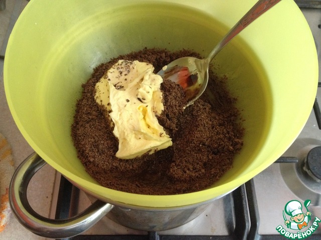 • Кофе растворить в столовой ложке кипятка. На водяной бане или в микроволновке растопить шоколад поломанный большими кусками и масло.