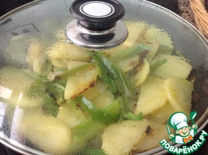 • Когда картошка немного подрумянится, убавить огонь и закрыть крышкой.