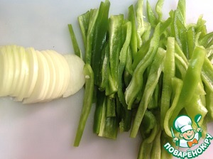 • Нарезаем перец соломкой и лук полукольцами.