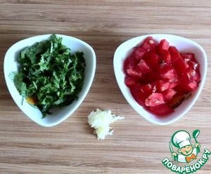 Помидор нарезать кубиками, кинзу нарубить, чеснок натереть на мелкой тёрке.