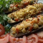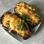 Начинить получившимся фаршем баклажанные лодочки. Присыпать хлебными крошками. Запекать при 180 градусах 10 минут.