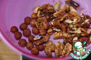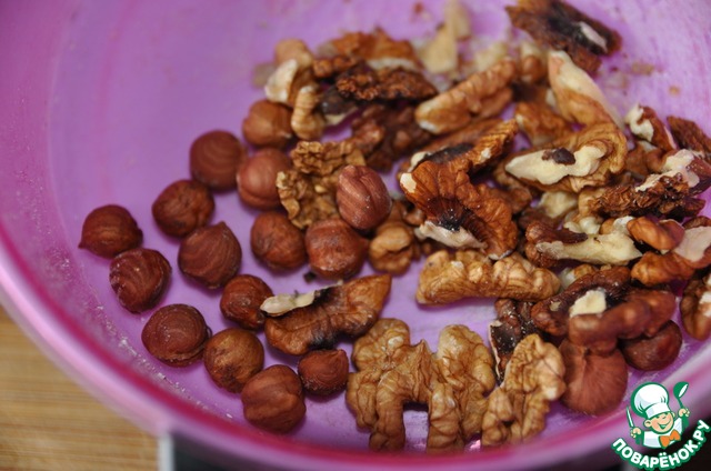 Берём грецкие орехи и фундук, мелко режем ножом или измельчаем блендером, но чтобы кусочки оставались ощутимыми на вкус.