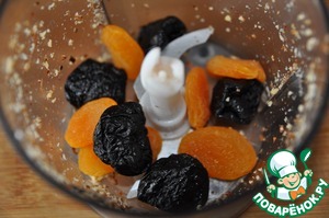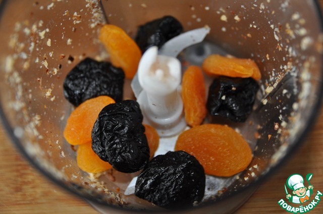 Берём любые сухофрукты по желанию, у меня курага и чернослив. Также режем мелко или измельчаем блендером.