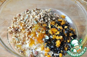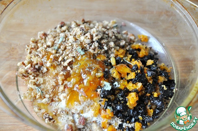 Добавляем дробленные орехи и сухофрукты к овсяным отрубям, туда же кладём апельсиновый джем, оливковое масло и сухую мяту.