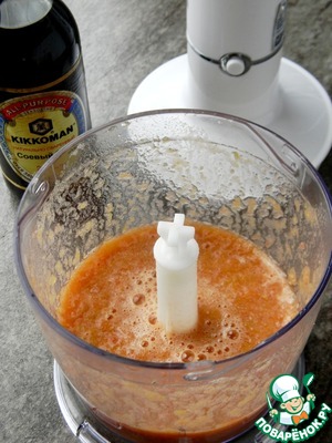 В чашу блендера сложить перец и помидор, добавить соевый соус.