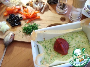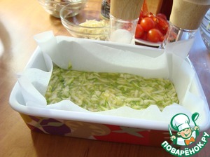 Кабачковую основу выложила в форму на бумагу. Поставила в духовку на 10 минут при 180*С.