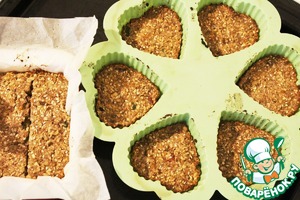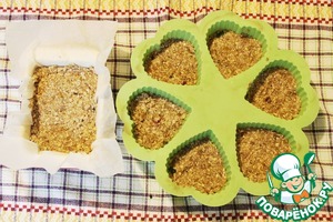 Заполнить формы, у меня силиконовая и керамическая. Толщина слоя должна быть около 2-х см, более тонкие изделия после выпечки крошатся.