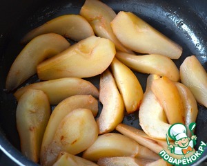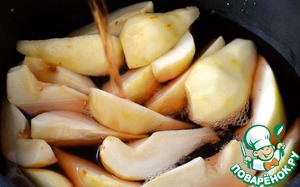Груши вымыть, очистить от кожуры, удалить сердцевину и нарезать дольками (покрупнее). Выложить груши в сотейник, залить вином и поставить на сильный огонь. Держать груши на огне, пока вся жидкость не выпариться. (вместо мускатного вина можно взять и розовое десертное вино).
