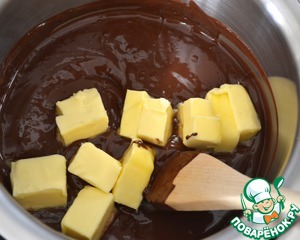 Шоколад (хорошего качества!) поломать на кусочки, выложить в миску и поставить на водяную баню. Как только шоколад растает, добавить 100 г сливочного масла кусочками и как следует размешать. Отставить шоколадную массу в сторону остывать.