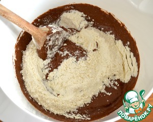 Следом добавить частями просеянную муку с разрыхлителем. Тесто получится поначалу достаточно густым - это нормально.