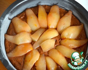 Духовку включить на 180 С. Форму диаметром 22-23 см смазать маслом и присыпать мукой. Выложить в нее половину теста и разровнять. Сверху по кругу выложить грушевые дольки. Не надо их сильно вдавливать в тесто...