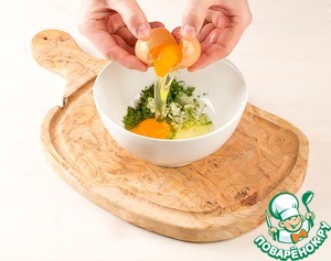 Яйца промыть и обработать, взбить с солью, перцем и мелко нарубленной зеленью и чесноком.