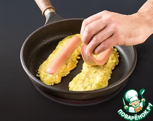 Часть массы сразу выложить на разогретую сковороду с растительным маслом в форме длинной полоски, размером чуть длиннее сосиски. Обжаривать на среднем огне 1-2 минуты. Затем на каждую полоску положить сосиску.