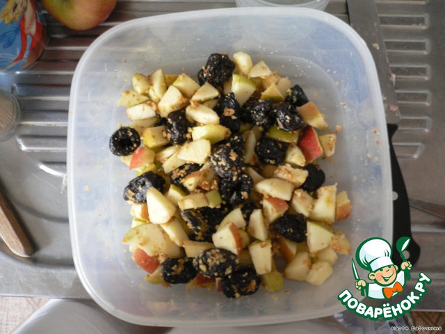 Затем сделать фаршировку: порезать яблоки (можно чуть крупнее чем на картинке). 2 яблок было достаточно. Чернослива у меня был небольшой пакетик, а так можно положить на глаз. Добавит молотый миндаль и перемешать.