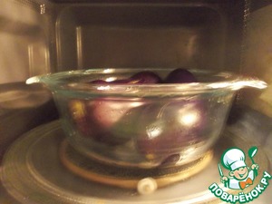 Баклажаны положить в стеклянную форму для СВЧ, проколоть кожицу зубочисткой в нескольких местах. Запекать в микроволновке на максимальной мощности 15 минут.