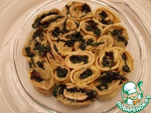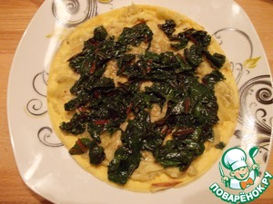 На омлет ровным тонким слоем выложить начинку из баклажана...