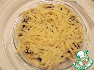 Сверху присыпать оставшимся сыром. Поставить в микроволновку еще на 2 минуты.