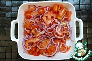 Помидоры режем крупными кусками. Лук полукольцами. Соединяем и посыпаем сахаром и солью. Оставляем минут на 10.