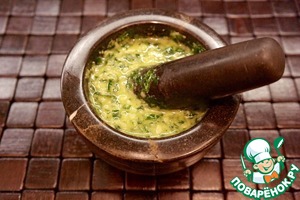 В это время делаем песто: соединяем все ингредиенты для соуса и смешиваем до однородной массы. Мне нравятся кусочки, поэтому я использовала простую ступку.