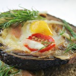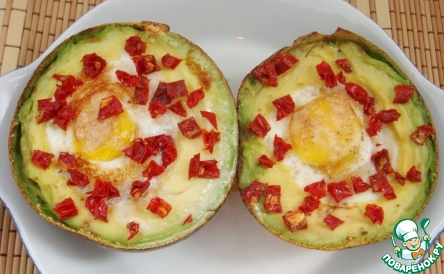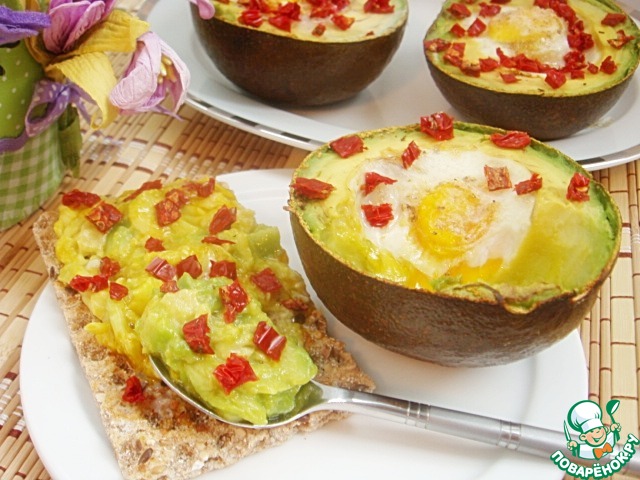 Посыпать нарезанными кубиками сушеных помидоров. В качестве топпинга также подойдут кубики обжаренного бекона, креветок, вяленых помидоров. Поскольку корочка стала жесткой, можно есть ложкой полужидкое яйцо вместе с мягким, горячим авокадо. Это такое наслаждение!