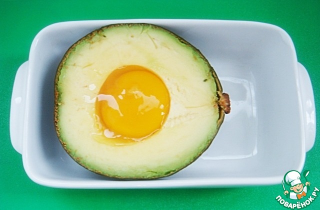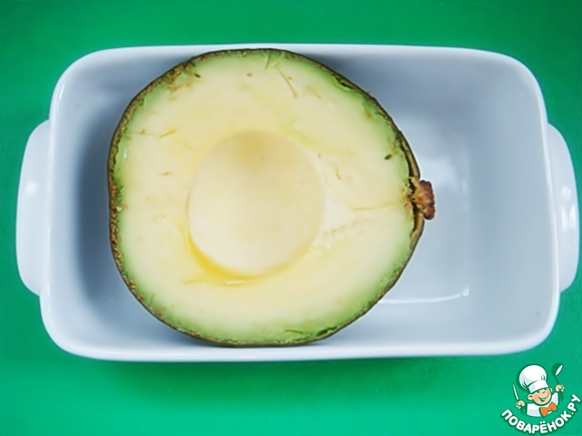 не достаточно большое для одного маленького яйца, ложкой сделать небольшое углубление. Для устойчивости срезать нижнюю часть каждого авокадо. -