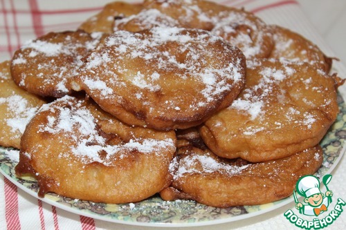 На вилку накалывать кружки яблок, обмакивать в тесто и опускать в кипящее масло. Жарить с обеих сторон до золотистого цвета.