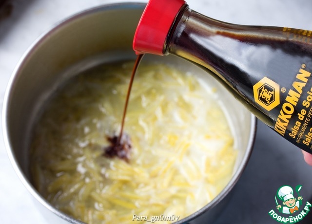 3. Растопить сливочное масло и обжарить в нем цедру (предварительно слив лишнюю воду). Добавить соевый соус, перемешать.