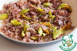 3. В двух ложках сливочного масла немного спассеровать прошутто, добавить цветки и спассеровать еще в течении двух минут.