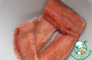 Рыбу выкладываем в форму для приготовления в микроволновой печи, предварительно смазав маслом, или постелив пергамент.