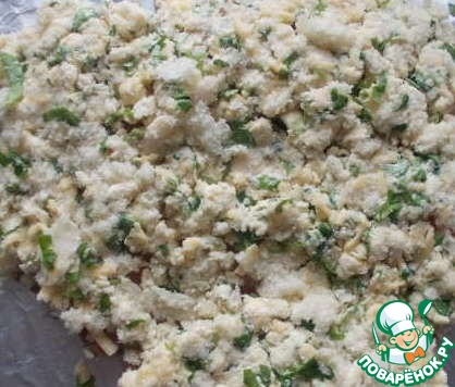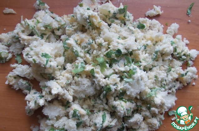 С батона срезать корочку и покрошить руками, натереть на терке сыр с маслом, нарезать мелко чеснок и зелень и все руками хорошо смешать.