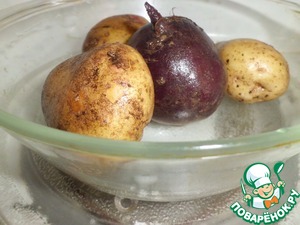 • Свеклу и картофель кладем в жаропрочную посуду, накрываем крышкой и отправляем в СВЧ-печь на 7 минут (мощность 750). Достаем картофель, кладем его в холодную воду, а свеклу отправляем еще на минутку в печь.
