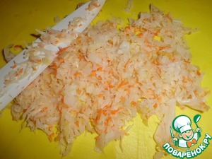 • Добавляем к ней морскую капусту (слегка отжатую) и мелко нарезанный лук.