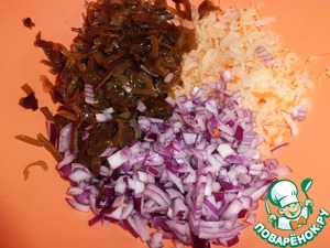 Добавляем к ней морскую капусту (слегка отжатую) и мелко нарезанный лук.