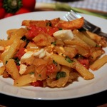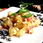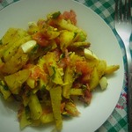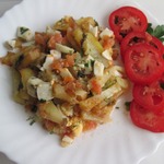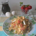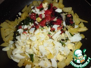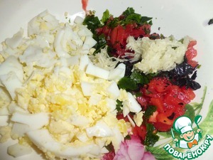 В это время очищаем помидоры от шкурки и зерен, мелко нарезаем. Добавляем к ним натертый на терке чеснок, базилик, петрушку и яйца, нарезанные не очень крупно.