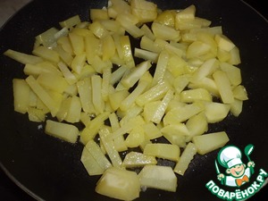 Картофель очищаем, нарезаем средней соломкой. Отправляем на сковороду, обжариваем на среднем огне, без крышки.