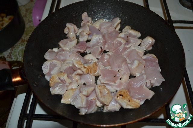 Порежьте курицу на кубики.