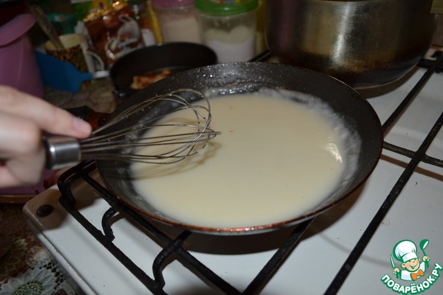 Снова поставьте сковороду на огонь и взбивайте 2 минуты до загустения. Затем добавьте сметану.