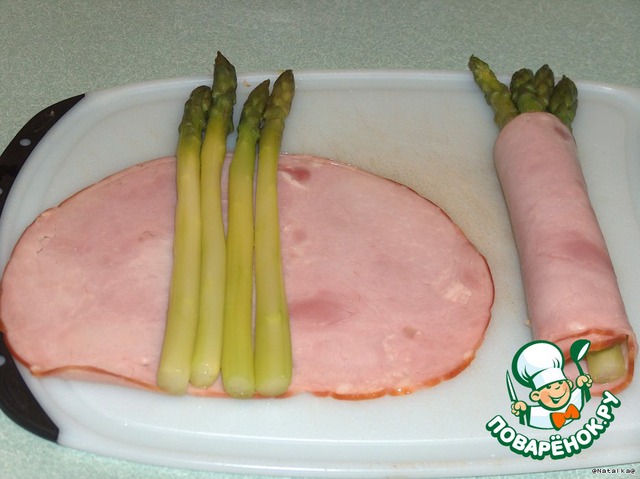 Берем по 4 спаржи и заворачиваем в колбаску рулетиком. -