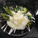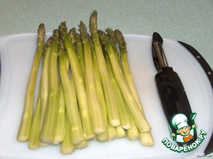 Спаржу почистить и отварить в подсоленной и подсахаренной воде минут 15-20.