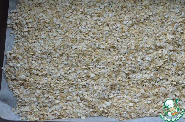 Овсяные хлопья выложить ровным слоем на противень и запечь 7-10 мин при 170С.