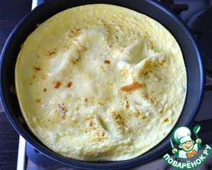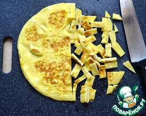 Приготовить омлет; яйца слегка взбить с молоком, посолить и обжарить омлет на сковороде с двух сторон. Отставить в сторону и дать немного остыть.