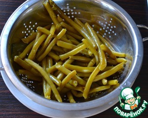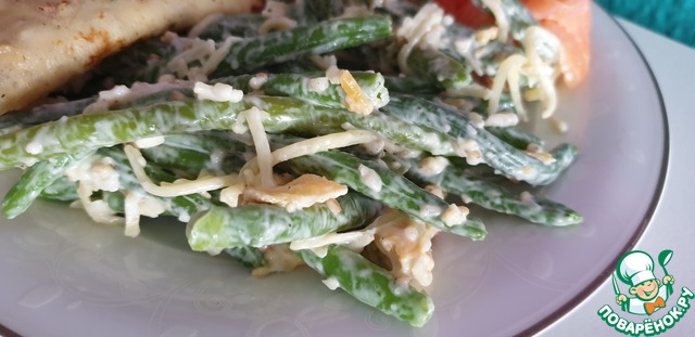 Такой оригинальный, вкусный и быстрый в приготовлении салат порадует любителей стручковой зеленой фасоли. Все в нем очень гармонично! В сезон попробовала заменить стручковую фасоль на спаржу, получилось тоже отлично! Кстати, фасоль можно использовать и свежую (как в рецепте-оригинале, в таком случае ее нужно просто отварить в течение 3-4 минут), но у меня консервированная, что значительно ускоряет процесс приготовления салата. ))) За рецепт благодарю автора Ксения26.