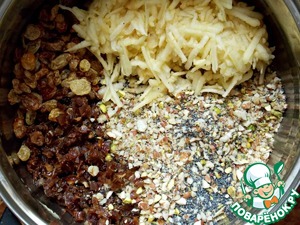 Орехи средне прорубить. Добавить мак, финик и яблоко, перемешать.