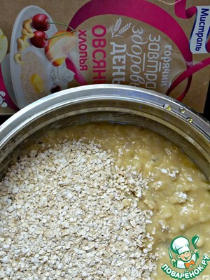 Бананы размять. Я использовала обыкновенную толкушку для картофеля. Смешать с маслом, добавить хлопья и перемешать.