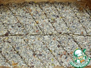Соединить обе смеси и перемешать. Выложить на застеленный силиконовым ковриком противень, разровнять и сразу наметить будущие батончики ножом.